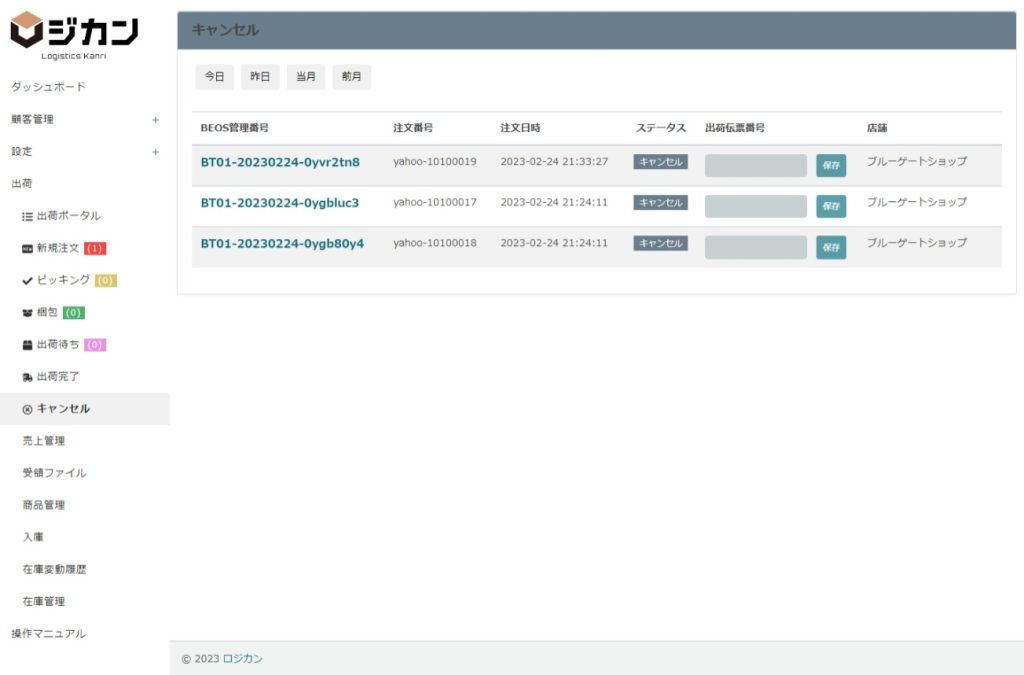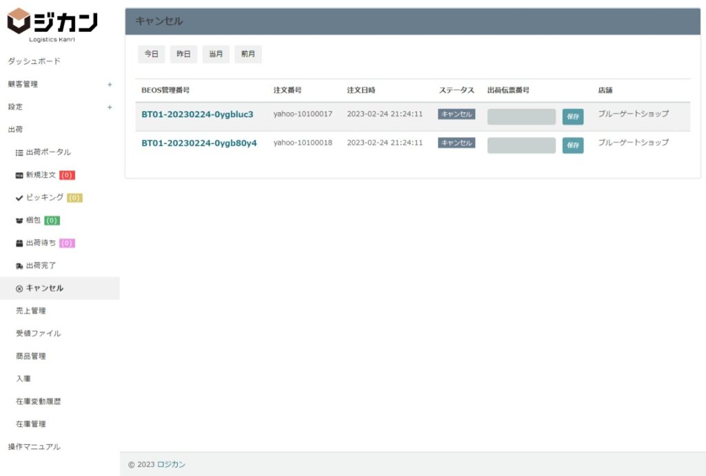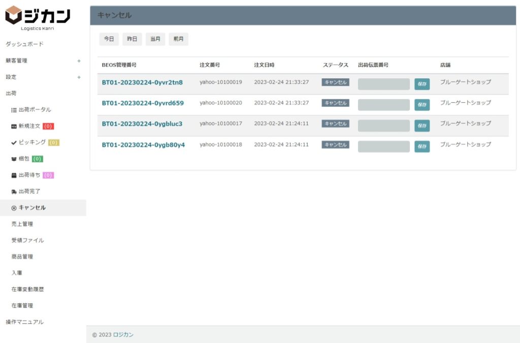 「キャンセル」となった注文情報は、この「キャンセル」に表示されます。