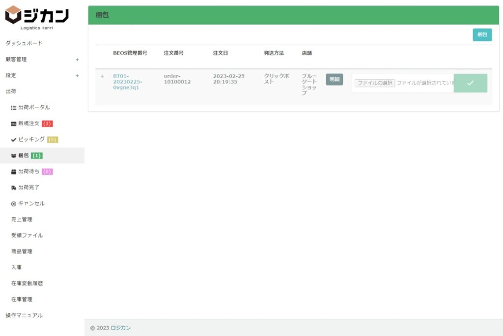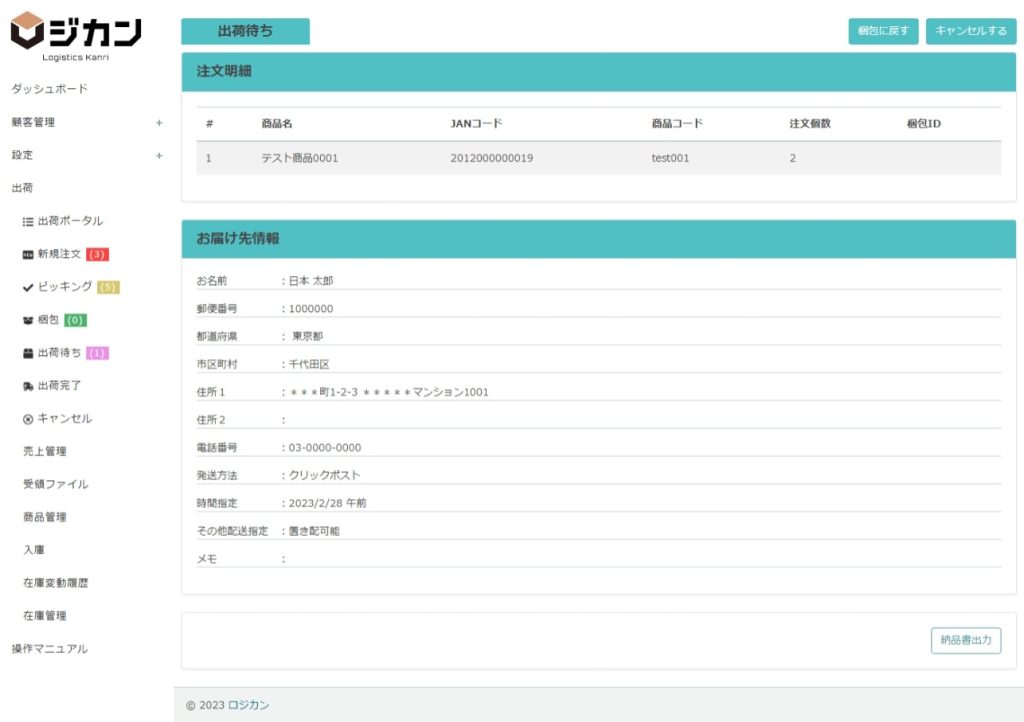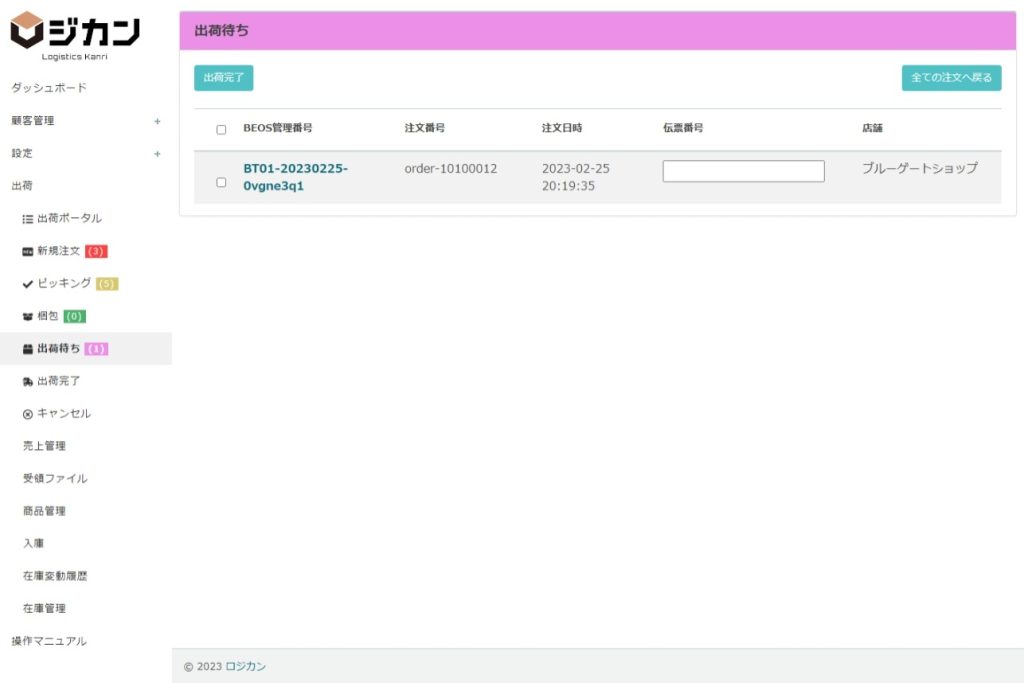 「出荷待ち」メニューから、対象の注文番号をクリックします。