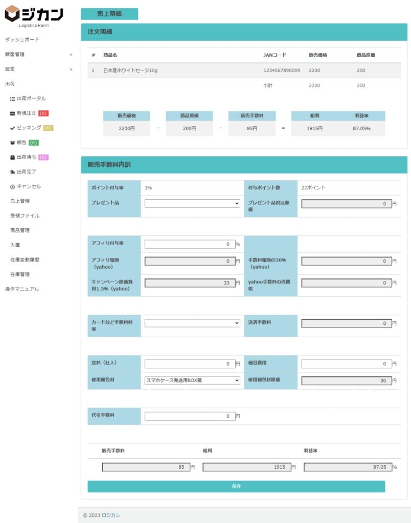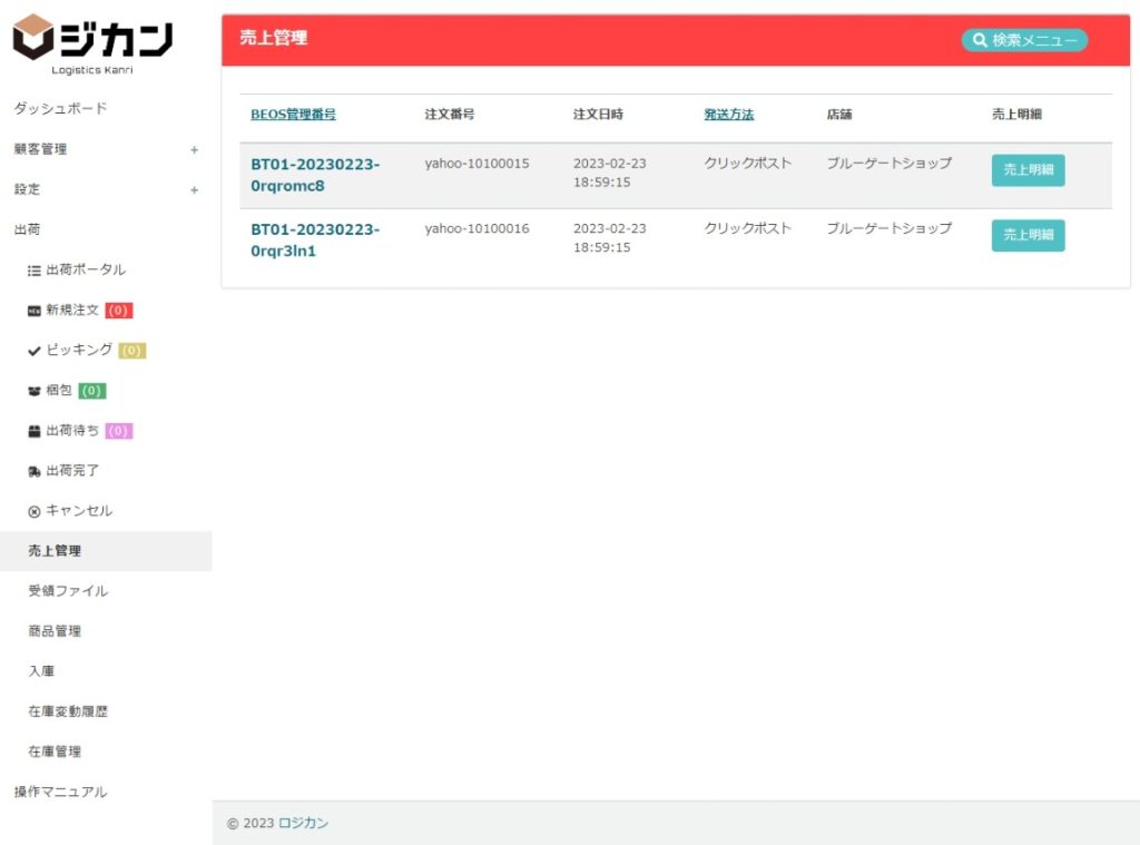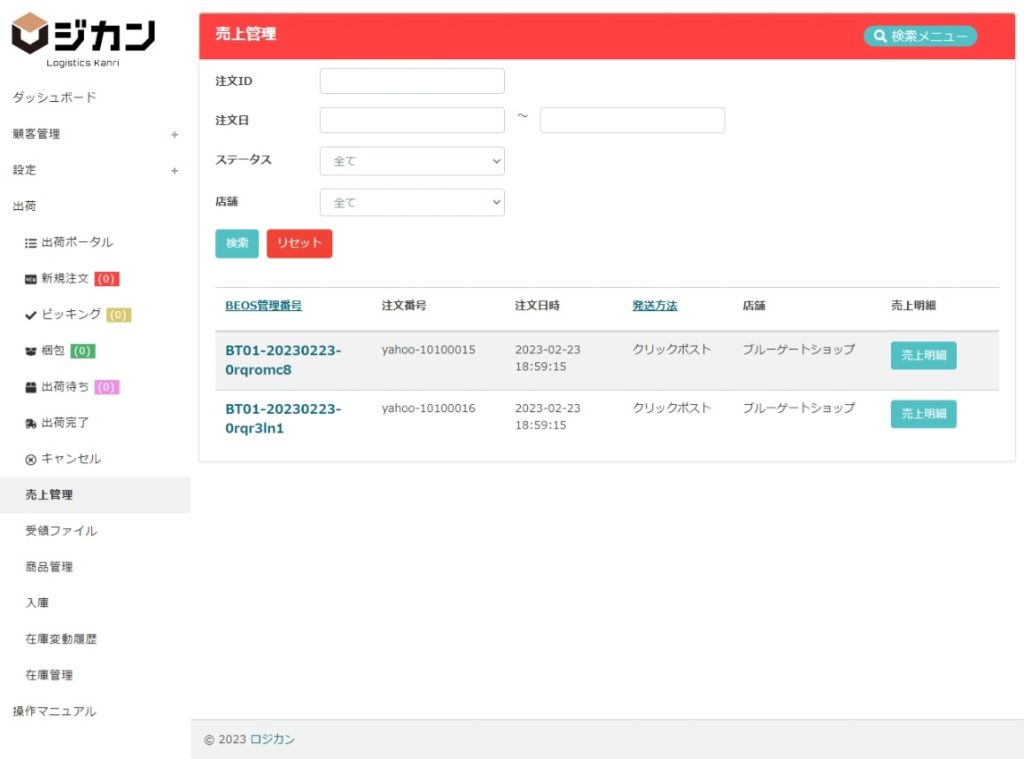 売上管理 出荷済み注文の売上状況の確認ができます。 売上管理の流れ 1 注文CSVファイル作成 2 注文CSVファイルのアップロード 3 売上明細の確認 1 売上状況一覧 出荷済み注文の売上状況一覧が表示されます。 2 売上の検索 右上の「検索メニュー」をクリックして特定の注文を検索します。 検索したい注文情報を以下の項目で検索することができます。 注文ID注文日付ステータス(プルダウン選択)種類(プルダウン選択) 3 売上明細の確認 注文情報右端の「売上明細」をクリックして売上明細を確認します。 「ポイント」「販売定数料」「送料」などを入力することにより、粗利や利益率を計算することができます。