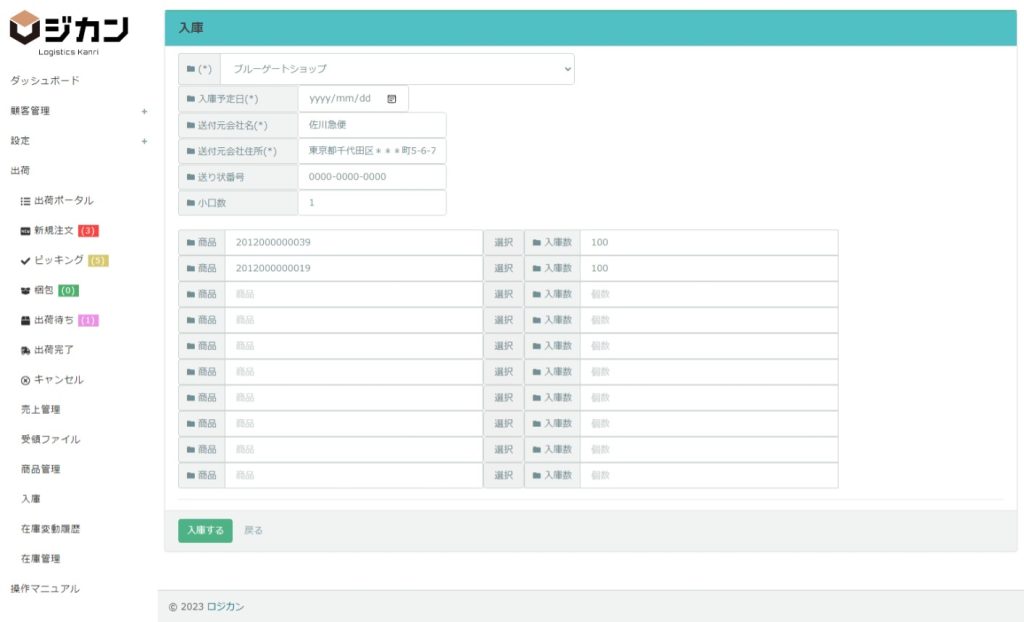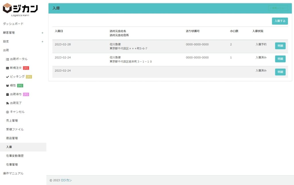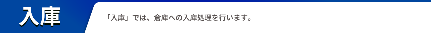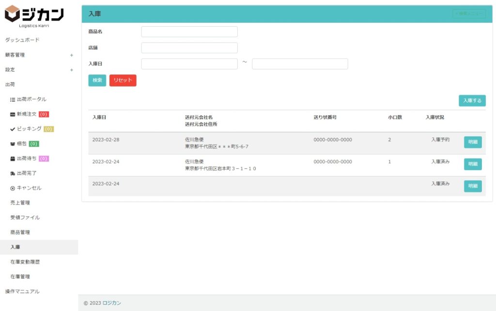 入庫 ロジカンへの商品入庫と入庫履歴が表示されます。 入庫の流れ 1 商品の入庫 2 入庫履歴の検索 1 商品の入庫 右上の「入庫する」ボタンをクリックし、入庫登録します。 「店舗名」「JANコード」「個数」を入力し、「入庫する」をクリックします。 2 入庫履歴の検索 右上の「検索メニュー」をクリックします。 以下の項目で検索することができます。 商品名店舗処理日