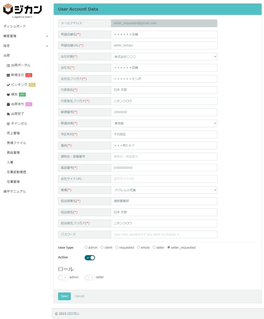 出店登録希望のユーザー情報が表示されますので、登録許可を与える場合は、「Active」をオンにして「Save」をクリックしてください。