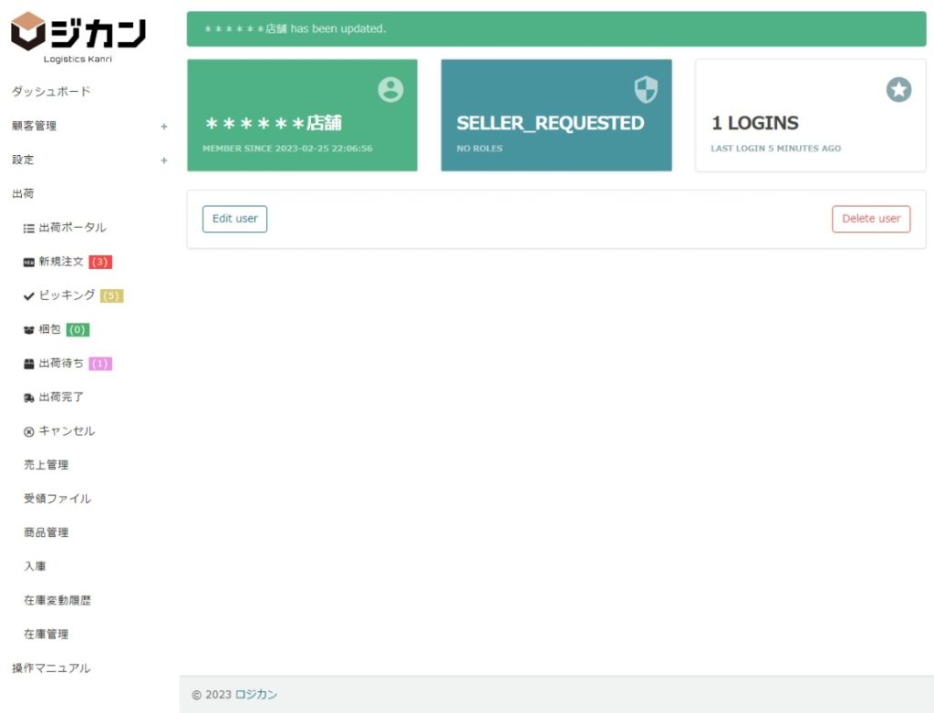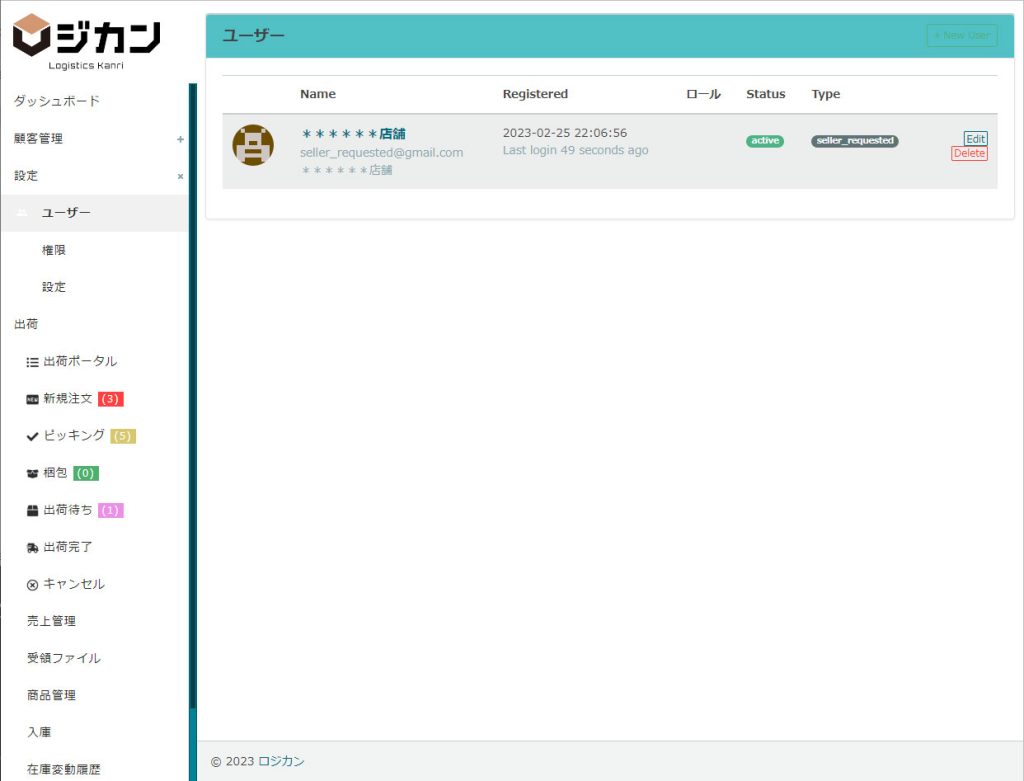 出店登録希望のユーザーのアイコン付近をクリックすると右端に「Delete」「Edit」が表示されますので、「Edit」をクリックし出店登録希望のユーザー情報を確認します。そのユーザーを削除する場合は、「Delete」をクリックしてください。